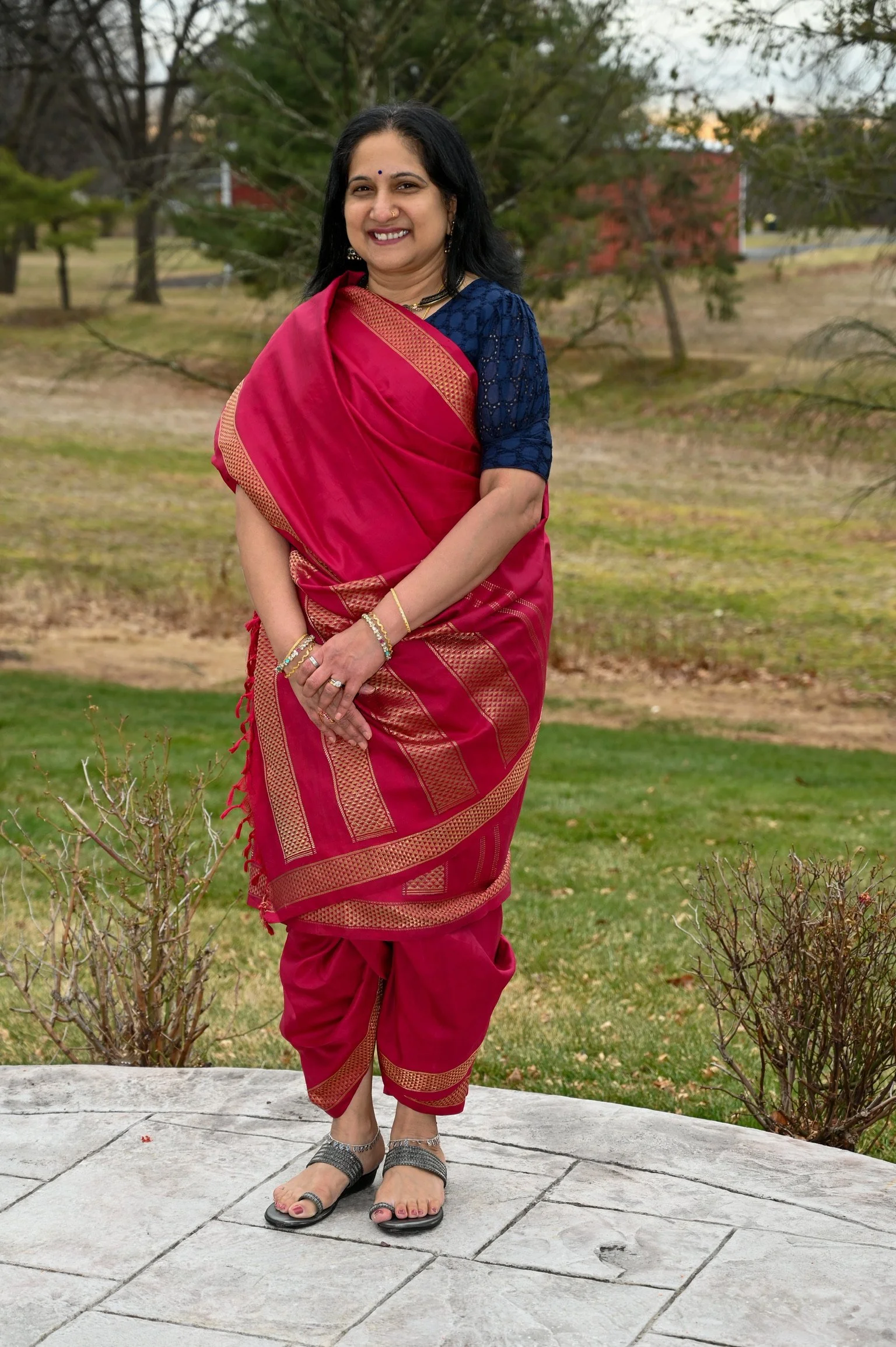 In my 29-year koorai pudavai, a Kanjivaram woven for my wedding and received with the blessings of Goddess Kamakshi. Lovely arakku cool wit arai madeam, borders. The first time a woman drapes a 9-yard saree is during her wedding with the help of her future sister-in-law. I have draped it in the Iyer style.